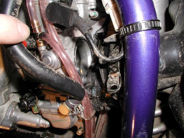 To determine how much to cut off the throttle screw, I pulled the air box boot off the carb, and removed the black plastic piece it was attached to. That way I was able to see and feel the throttle slide itself as I backed out the original, unmodifed screw. You can probably avoid this step if you trust my measurements and the likelihood that Yamaha made all the carbs and throttle stop screws the same. Besides, your carb isn't likely any different than mine.