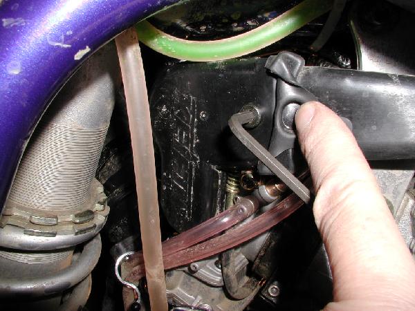 The throttle stop screw is also a 4mm allen, but it's lock-tighted and requires some care in removing so as not to damage the screw. You probably won't be able to get anything other than a simple allen wrench to fit the tight space behind the shock reservoir. You may even need to hack off the end of your allen wrench a bit.