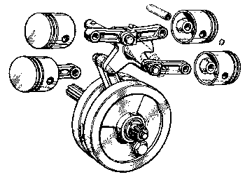The crankshaft ran along the machine, below all the cylinders, and was of a single-throw design. In fact, for the prototype, a modified assembly from a 150 cc New Imperial was used. Above the crankshaft was a T-shaped beam, which was pivoted at the junction of the leg and arms, this axis also Iying along the machine. A master con- necting rod joined the end of the T-leg to the crankshaft, so as this rotated, the beam oscillated. The arm of the T was set vertically, and each end was attached to two connecting rods, which pointed in opposite directions and ran out to the pistons. Thus, these moved in pairs, and the two pairs moved in opposition.